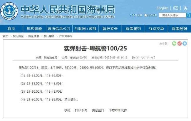据中国海事局网站消息,珠海海事局发布航行警告,5月19日、5月20日,9时至15时,南海部分海域进行实弹射击,禁止驶入。