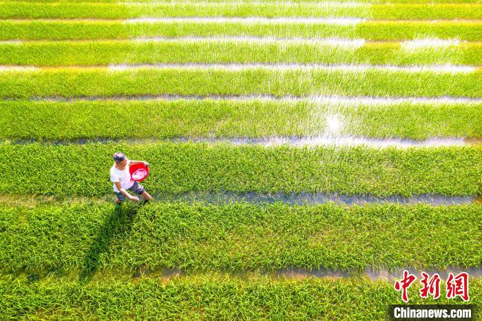图为农民在贵州省黔西市洪水镇水稻秧田里为稻秧施肥(无人机照片)。史开心 摄