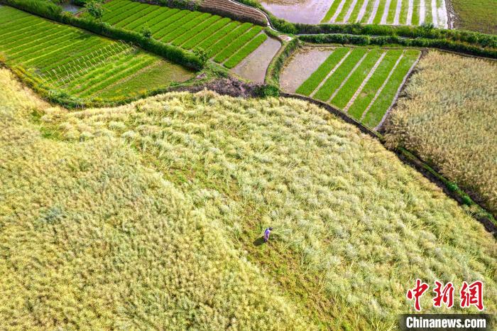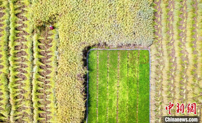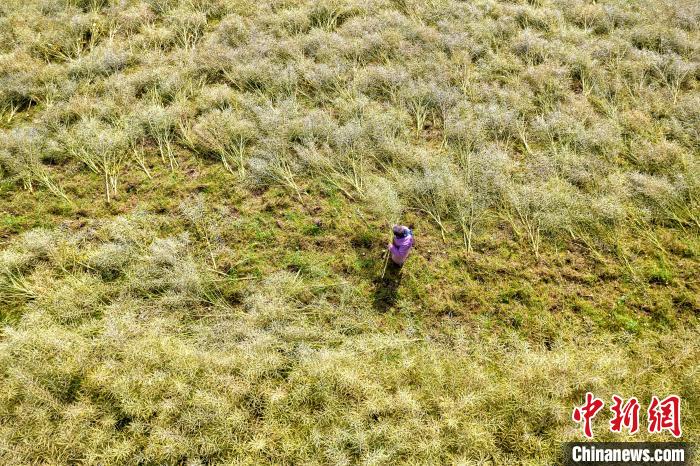 图为农民在贵州省黔西市洪水镇田间收割油菜籽(无人机照片)。史开心 摄