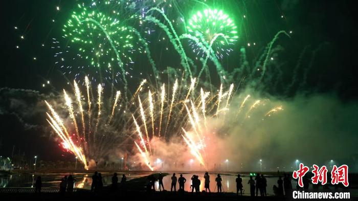图为璀璨烟花点亮湖北三国赤壁古战场。(无人机照片)陈红菊 摄