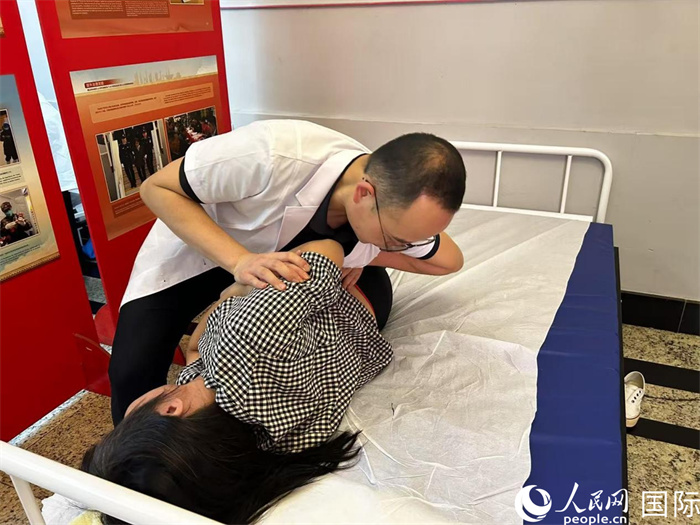 活动现场,四川省骨科医院天府院区颈肩腰腿痛科副主任医师吴忌正在为当地侨胞推拿。人民网记者 陈一鸣摄
