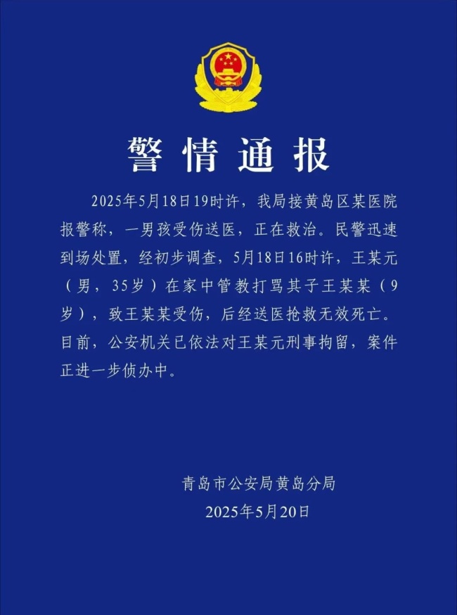 父亲管教打骂儿子致其死亡 青岛警方通报案情进展。5月18日晚,青岛一名9岁男孩被其父亲殴打后送医,最终抢救无效身亡。5月20日,青岛市公安局黄岛分局发布通报称,5月18日16时许,35岁的王某元在家中管教并打骂儿子王某某,导致孩子受伤。随后,孩子被送往医院救治,但不幸去世。目前,警方已依法对王某元采取刑事拘留措施,案件正在进一步侦办中。