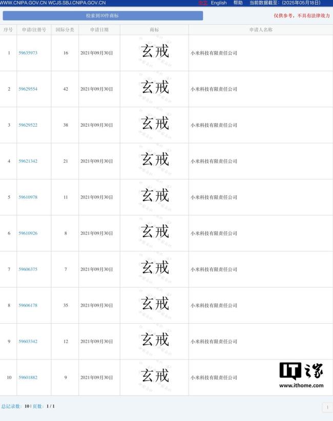 早在2021年,小米科技有限责任公司已成功注册多个“玄戒”商标,涉及科学仪器和广告销售等多个分类。