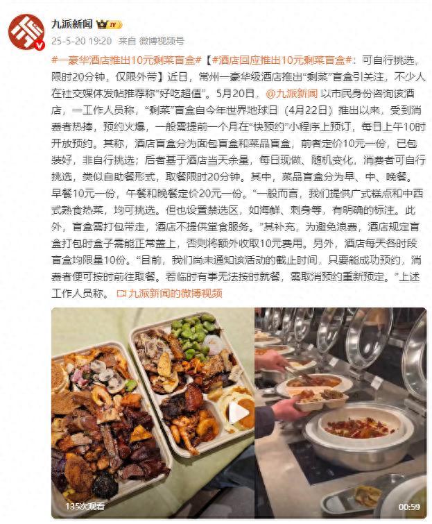 近日,常州一家豪华酒店推出“剩菜”盲盒,引起广泛关注。许多人在社交媒体上发帖推荐,称其“好吃超值”。咨询该酒店得知,“剩菜”盲盒自今年世界地球日(4月22日)推出以来,受到消费者热捧,预约非常火爆,通常需要提前一个月在“快预约”小程序上预订,每日上午10时开放预约。