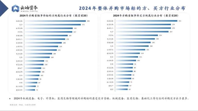 2024年,医药生物行业的买方“出手”次数仅次于机械设备领域,在整体市场中位于第二位;在并购标的中,医药生物同样是最受买方青睐的行业之一,居于第三位。