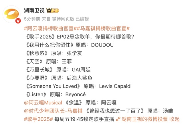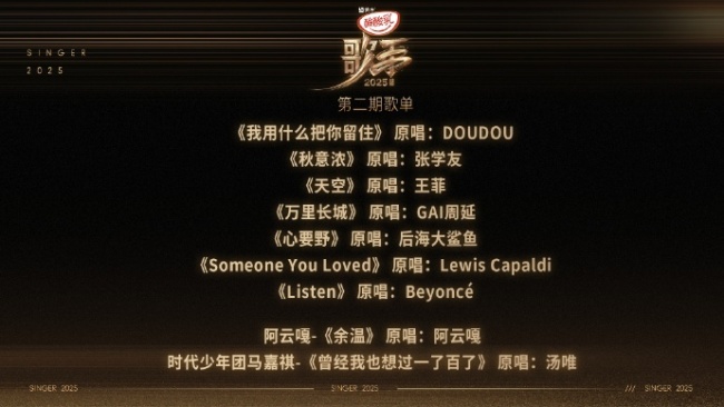 5月22日,湖南卫视公布了《歌手2025》第二期的歌单。其中包括: