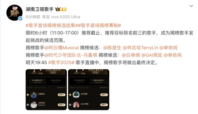 此外,阿云嘎和马嘉祺分别揭榜候选陈楚生、林志炫、单依纯以及白举纲、GAI、单依纯。按照比赛规则,如果一位揭榜歌手挑战成功,综合两场排名最末的一位在线歌手将被淘汰;如果两位揭榜歌手均挑战成功,则综合两场排名最末的两位在线歌手将被淘汰,首发7位歌手中将有2人被淘汰。