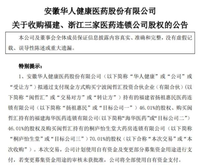 具体来看,华人健康拟以1.33亿元购买闽哲汇持有的福建省扬祖惠民医药连锁有限公司46.01%股权、1.25亿元购买福建海华医药连锁有限公司46.01%股权以及6825.98万元购买桐庐怡生堂大药房连锁有限公司70.01%股权。