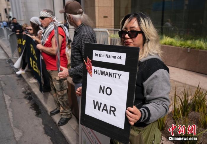 资料图:当地时间2023年10月13日,多名巴勒斯坦支持者在以色列驻美国加州旧金山总领事馆前举行抗议活动。中新社记者 刘关关 摄