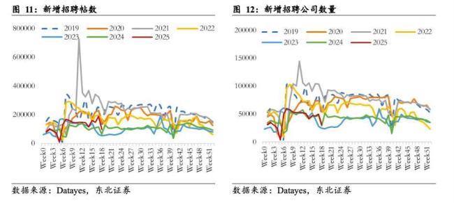 Datayes数据显示,2024年10月-12月,在线招聘平台新增招聘帖数分别为17%、21%、14%,2025年1-4月新增招聘贴数的同比增长24.1%。