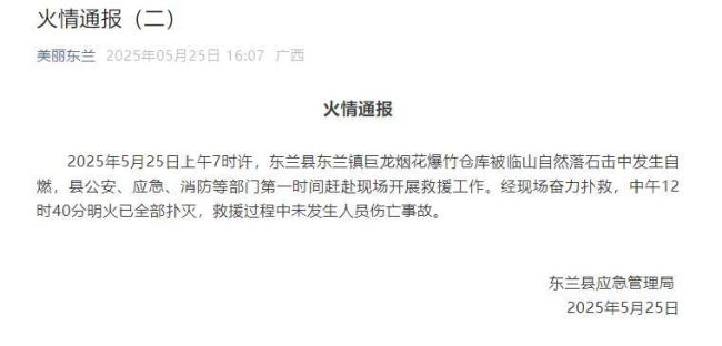 5月25日上午7时许,广西河池东兰县东兰镇巨龙烟花爆竹仓库被临山自然落石击中发生自燃。县公安、应急、消防等部门迅速赶往现场进行救援。经过奋力扑救,中午12时40分明火已全部扑灭。整个救援过程中没有人员伤亡。