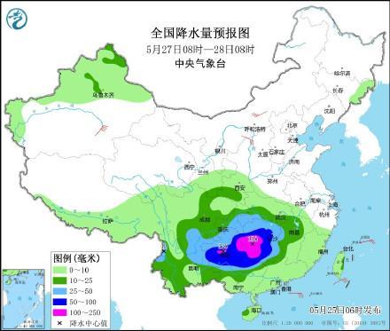 中央气象台预计,5月27日至29日,南方地区将出现新一轮强降雨过程。贵州、江南、华南等地有大到暴雨,部分地区如江南南部和华南北部可能出现大暴雨,局地甚至有特大暴雨。贵州东南部、湖南南部、江西南部、广西北部、广东北部、福建南部等地累计降雨量预计在80~180毫米之间,局地可达300~350毫米。此外,上述地区还将伴有短时强降雨,局地可能伴有雷暴大风、冰雹等强对流天气。