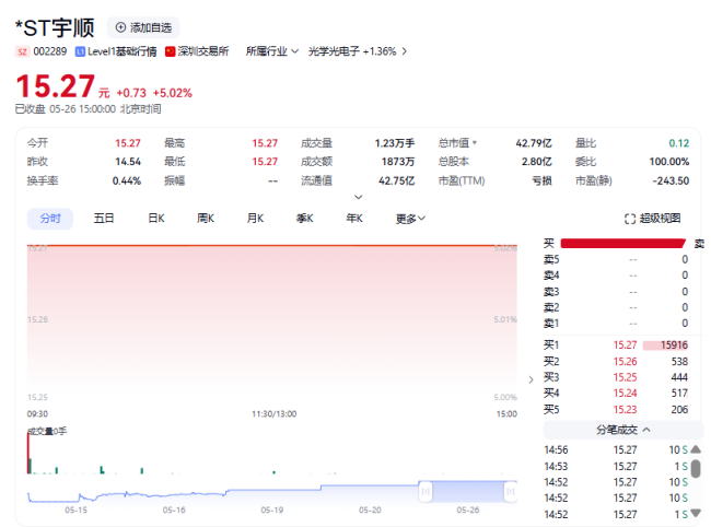 5月26日,*ST宇顺(002289)开盘涨停。截至北京商报记者发稿,公司股价仍封死涨停,报涨停价15.27元/股。