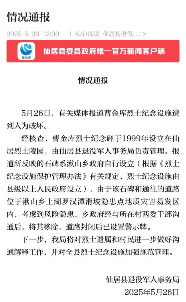 5月26日,媒体报道了浙江省台州市仙居县曹金库烈士纪念设施疑似遭到人为破坏的事件。当天中午,仙居县退役军人事务局发布情况通报,表示曹金库烈士纪念碑于1999年设立在仙居烈士陵园,由该局负责管理。