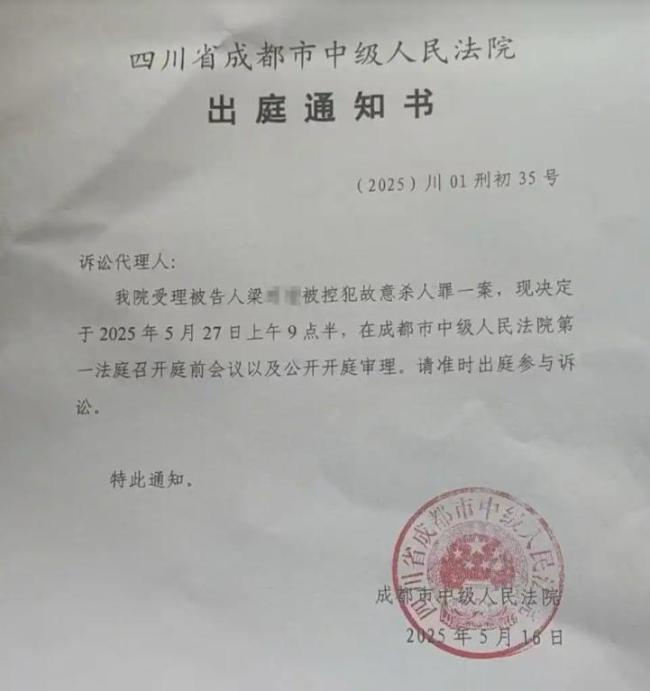 2024年6月9日,四川省成都市郫都区中航城小区内发生一起故意伤人事件,27岁女子王某某在家门口遭同小区居民梁某某持刀袭击身亡。案发近一年后,该案原定于今日上午9点半在成都市中级人民法院公开开庭审理,检方以故意杀人罪对梁某某提起公诉。