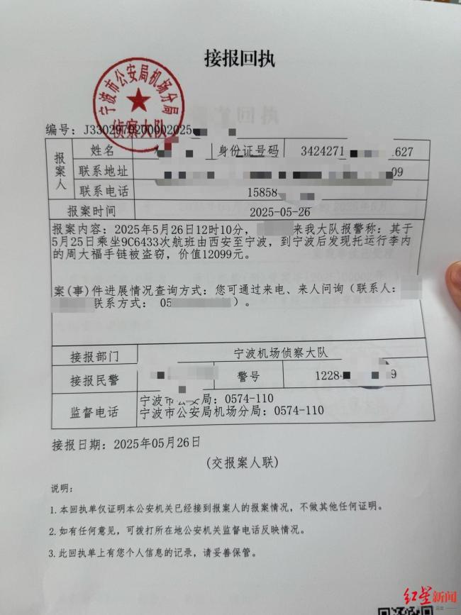 目前,宁波市公安局机场分局已接到杨女士的报警,并受理此案。据杨女士介绍,她原本不打算托运行李,但在过安检时因行李超重被要求办理托运。抵达宁波后,她看到行李箱的密码锁完好无损,便直接带回家。回到家打开行李箱后,发现首饰盒内的金手链不见了,随即报警。
