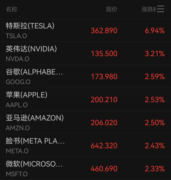 特斯拉市值一夜增超5400亿!当地时间5月27日,美国总统特朗普宣布将推迟对欧盟商品征收50%关税,这一消息促使美国股市收盘上涨。道指涨1.78%,标普500指数涨2.05%,纳指涨2.47%。大型科技股普遍上涨,特斯拉股价大涨近7%,市值一夜增加约759亿美元。