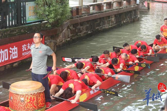 5月22日下午,雨后初晴,叠北社区东胜村信存何公祠门前的河道上,近50名龙船队员爬上龙船,整齐地发出“呼、呼、呼”的“战歌”。按当地习俗,喊完这一鼓舞士气的“战歌”,队员们就要开始新一段“龙船征程”。