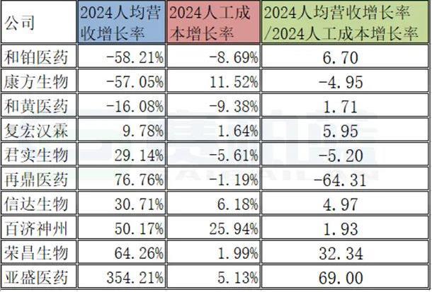 从此图表中可以看出,再鼎医药的2024人均营收增长率/人工成本增长率的比值是-64.31,其中,2024年人工成本增长率是-1.19%,2024人均营收增长率是76.76%。