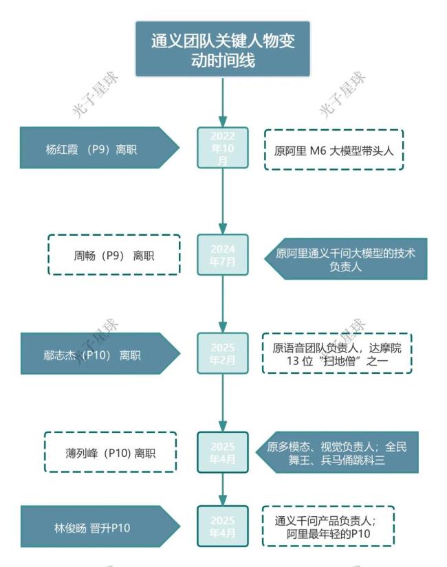 通义团队核心人物变动,要追溯到2022年杨红霞的离职,其带领研发的“多模态预训练模型M6”,是现在通义千问底座模型的前身。而后,2024年通义千问大模型技术负责人周畅被字节挖走,彻底开启了通义的“人事之变”。