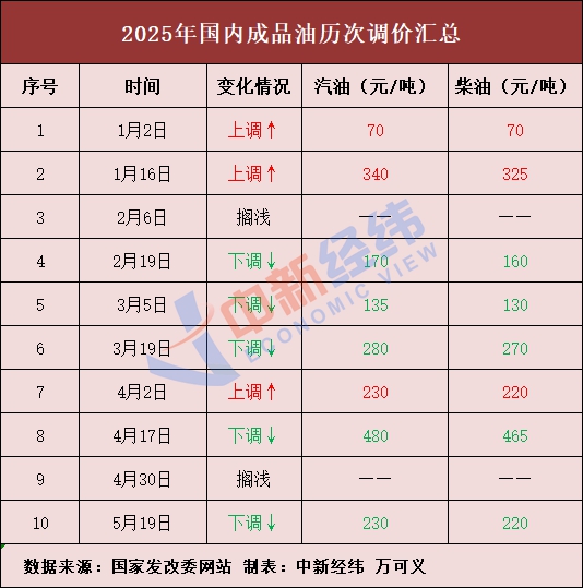 中新经纬注意到,今年以来,国内油价已经历十轮调价窗口,分别为“三涨五跌两搁浅”。涨跌互抵后,国内汽、柴油价格每吨较去年底分别下调655元、630元。若本轮调整落地,2025年调价格局将变为“四涨五跌两搁浅”。