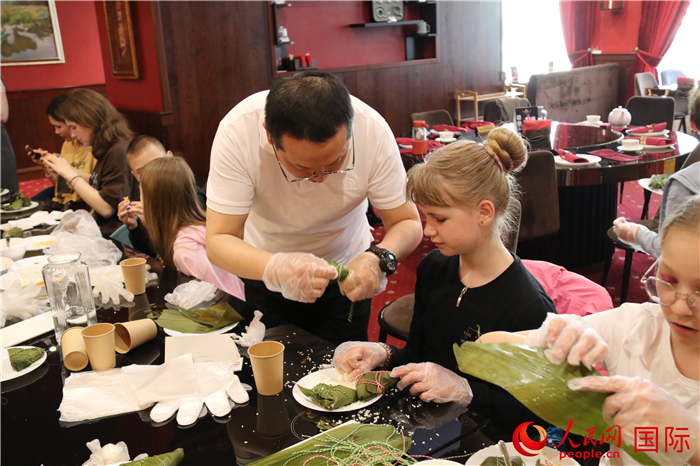 乌克兰儿童学习体验包粽子。人民网记者蔡子畅摄