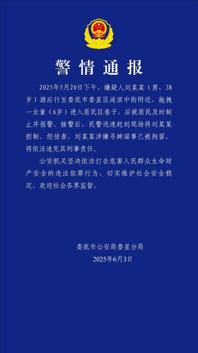 2025年5月20日下午,38岁的刘某某酒后在娄底市娄星区涟滨中街附近拖拽一名6岁女童进入居民区巷子,被居民及时制止并报警。民警迅速赶到现场将刘某某控制。经侦查,刘某某因涉嫌寻衅滋事已被拘留,并将依法追究其刑事责任。