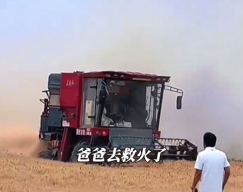 近日,山东,一家三口开收割机路遇麦田起火。丈夫见状,驾驶收割机冲入火海抢收小麦。