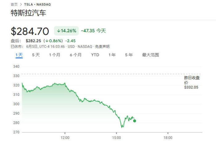 6月5日,马斯克与特朗普反目互怼后不久,由马斯克任首席执行官的电动汽车企业特斯拉的市值迅速蒸发了约千亿美元,特斯拉股价当日一度暴跌16%。截至当天收盘,特斯拉股价较开盘时跌去14.26%,市值蒸发超1500亿美元。