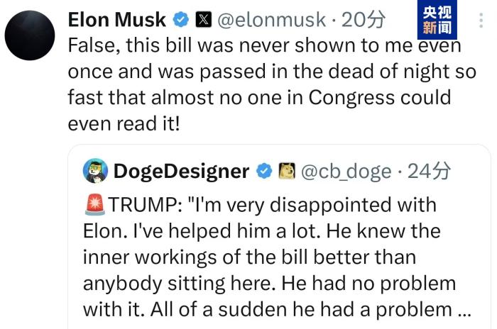 在特朗普发表对马斯克的评价后,马斯克迅速在社交媒体上回应并反驳称,“大错特错,这项法案一次也没有给我看过,而且是在深夜迅速通过的!”