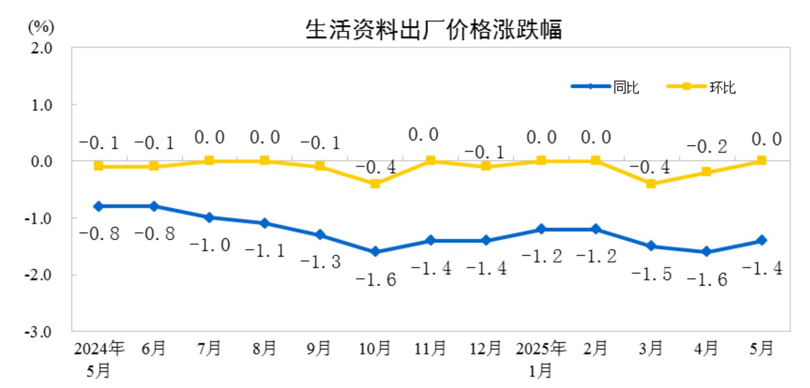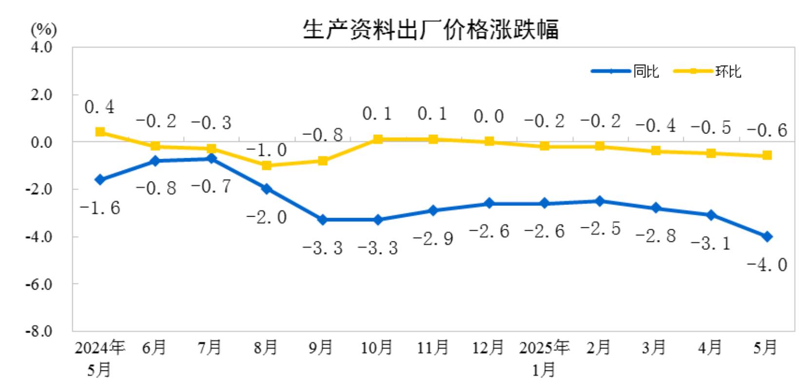 中新网6月9日电 据国家统计局网站消息,2025年5月份,全国工业生产者出厂价格同比下降3.3%,环比下降0.4%;工业生产者购进价格同比下降3.6%,环比下降0.6%。1—5月平均,工业生产者出厂价格和购进价格比上年同期均下降2.6%。