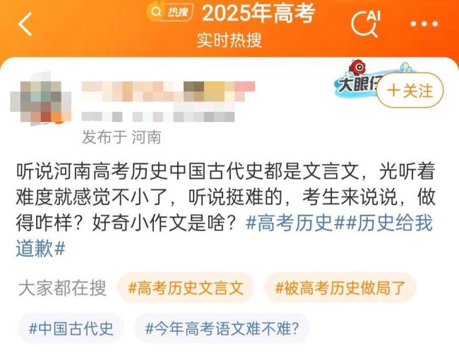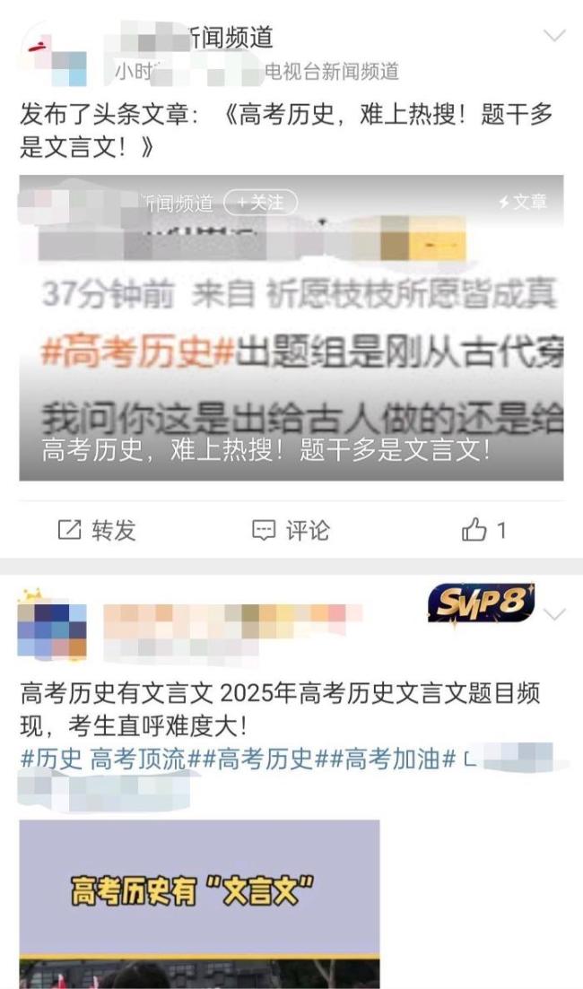 6月8日,2025年高考历史科目考试结束后,“历史高考顶流”“高考历史”等词条陆续冲上热搜榜。当天下午,有网民反映部分省份高考历史试题使用文言文材料,文言文题干比例高,考查深度史实分析能力。一些考生因时间紧张或题型陌生未能完成作答,引发广泛讨论。
