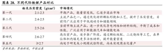 所谓压实密度,指的是在一定的压力下,电池极片单位体积内所含材料的质量,与极片比容量、效率、内阻以及电池循环性能有密切的关系。在体积不变的前提下,要提升电池的能量密度,需要提升铁锂正极片的极片压实密度。行业内普遍将磷酸铁锂划分为五代产品,目前市场以第二代、第三代产品为主流,第四代需求增长迅速,第五代处于研发或小规模试验阶段,尚未实现商业化量产。
