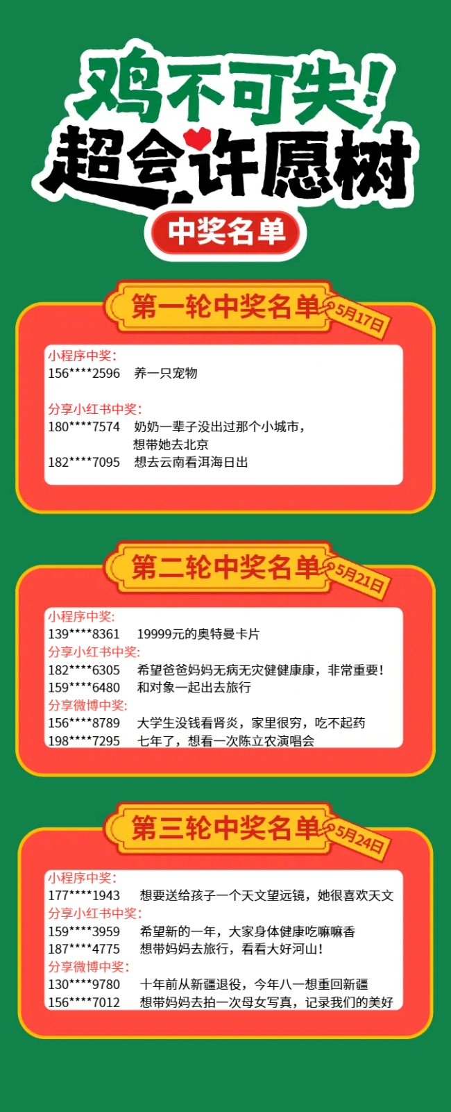 今年,在首年活动的基础上,老乡鸡再创“帮超会实现心愿”的玩法。在老乡鸡小程序上发起“鸡不可失·超会许愿树”活动,会员参与活动即有机会被实现愿望。在老乡鸡小程序上,数万人参与许愿活动。会员将活动分享到微博和小红书平台,还有机会获得额外奖励。在微博、小红书等平台,“帮超会实现心愿”活动也引发了十万级参与和超过4000条的用户自创内容。