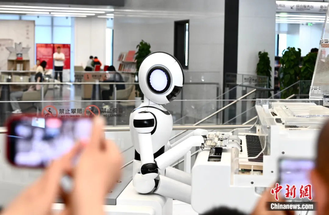 市民被演奏钢琴曲的机器人吸引。 中新社记者 韩苏原 摄
