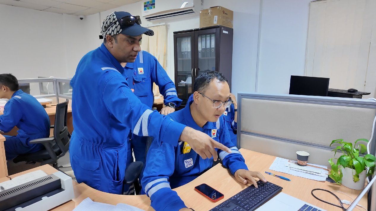 阿迪尔和中方工作人员研讨施工方案。中国石油工程建设有限公司海湾地区公司供图