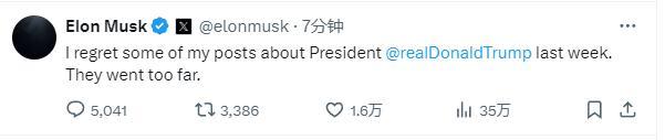 美东时间11日凌晨,特斯拉与SpaceX首席执行官埃隆·马斯克在其社交媒体平台“X”上表示,他对上周发表的一些关于美国总统特朗普的帖子感到后悔,称内容说得太过了。
