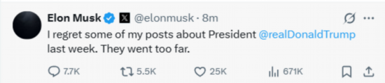 马斯克在社交媒体X上发文说:“我对自己上周发的关于总统特朗普的一些帖文感到后悔。它们太过了。”