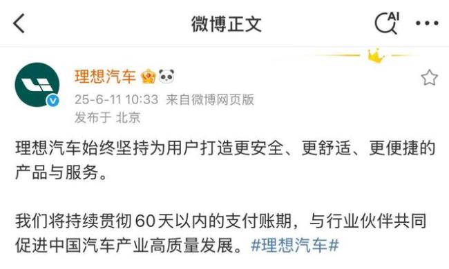 理想将持续贯彻60天以内的支付账期 促进汽车产业高质量发展!理想汽车最近加入了广汽、一汽、东风汽车、赛力斯、吉利汽车、长安汽车、比亚迪、奇瑞、小鹏汽车、长城汽车和小米汽车等企业的行列,发布了账期承诺。理想汽车宣布将坚持60天以内的支付账期,与行业伙伴共同努力推动中国汽车产业的高质量发展。此前,广汽、一汽和东风也已经承诺账期不超过60天。