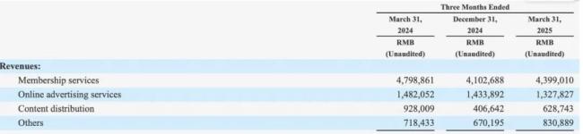 2025年一季度财报显示,会员服务收入44亿元,虽仍贡献总营收的六成,同比下滑8%;在线广告收入13.3亿元,同比下降10%;内容分发收入6.29亿元,骤降32%。唯一亮点是其他收入同比增长16%至8.3亿元,但难以扭转整体颓势。