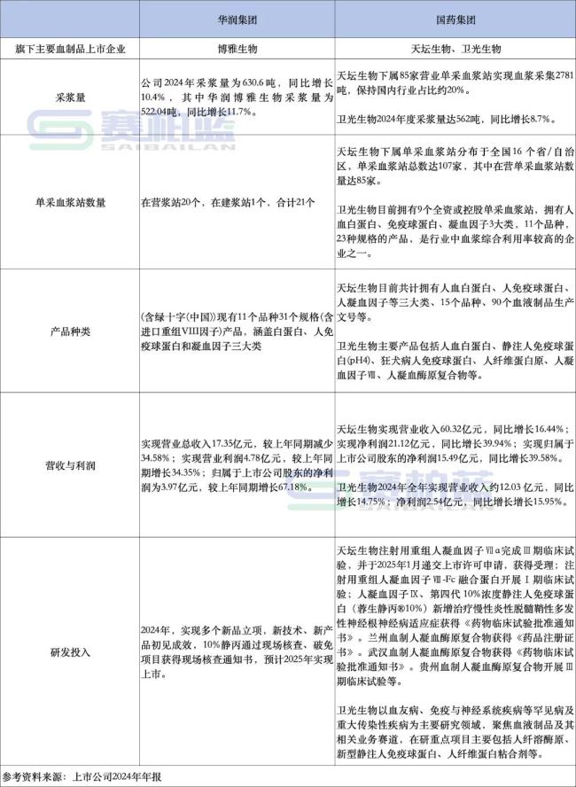两大集团重要的血制品公司,华润医药旗下的博雅生物和国药集团旗下的天坛生物以及卫光生物,对比如下——