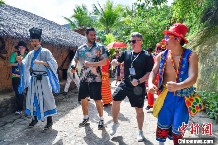 6月9日,在海南槟榔谷黎苗文化旅游区,卢克(右2)、亚历克斯(左2)与景区的工作人员跳舞互动。中新网记者 骆云飞 摄