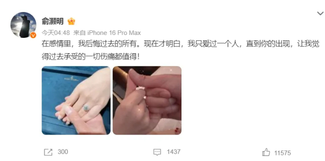 此前,5月17日,男演员俞灏明在社交媒体上晒出钻戒照和拉钩照,并写道:“直到你的出现,让我觉得过去承受的一切伤痛都值得!”照片中还附有文字:“晨,四个月了,我真的很想很想为你戴上那只真正属于无名指上的钻戒,我爱你,永远……”这一举动疑似官宣与王晓晨结婚,但王晓晨并未对此条微博做出回应。