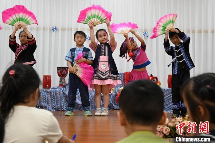 图为小朋友体验当地传统戏曲壮剧表演。黄数情 摄