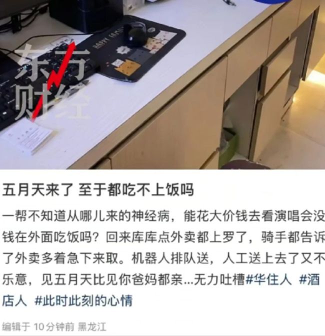 6月16日,有网友爆料称,全季酒店一名员工在社交媒体上吐槽五月天粉丝演唱会结束后点外卖的行为。该员工表示:“五月天来了,至于都吃不上饭吗?一帮不知道从哪儿来的神经病,能花大价钱去看演唱会没钱在外面吃饭吗?回来库库点外卖都上楼了,骑手都告诉了外卖多,着急下来取。机器人排队送,人工送上去了又不乐意,见五月天比见你爸妈都亲...无力吐槽。”