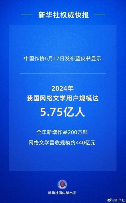 中国作家协会6月17日发布的《2024中国网络文学蓝皮书》显示,我国网络文学用户规模达5.75亿人。核心阅读群体为26至45岁的读者,约占全部读者的50%;“00后”读者占比近25%。