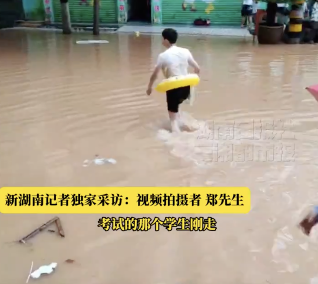 6月19日上午,湖南省湘西土家族苗族自治州龙山县遭遇暴雨袭击。一名中学生为了不耽误中考,带着救生圈蹚过积水区赶考的视频引起了广泛关注。视频拍摄者称,该视频拍摄于龙山县民安街道宝塔社区,水已经淹到一层、二层楼房,这名学生怕赶不上考试,选择游泳通过积水路段。