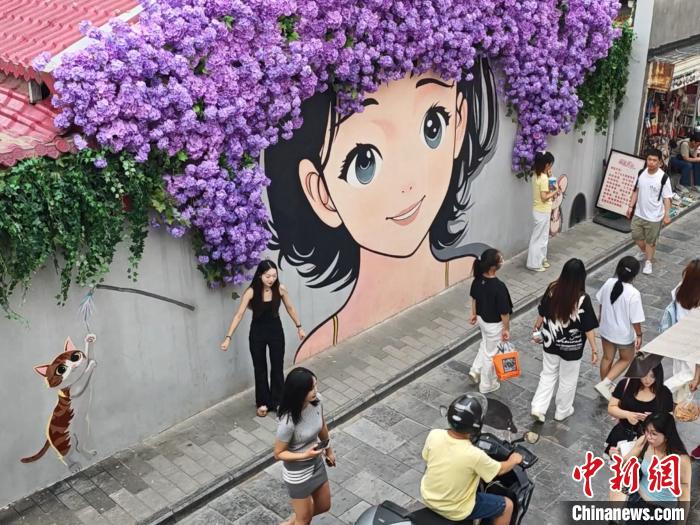 图为民众在西安老菜场文化创意街区的涂鸦墙前拍照。党田野 摄