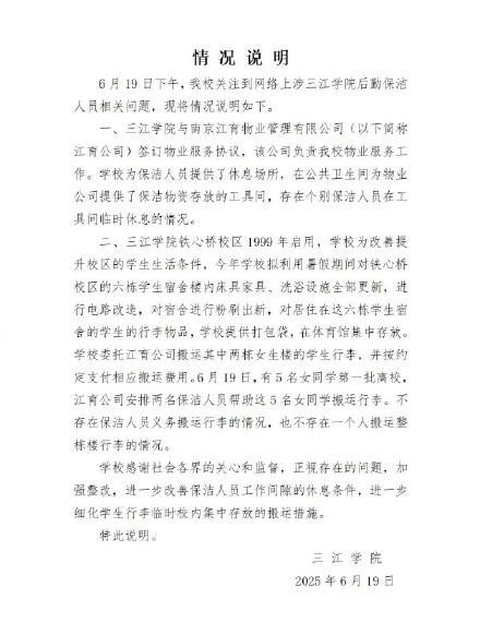 关于搬运行李的问题,通报称,学校委托江育公司搬运其中两栋女生楼的学生行李,并按约定支付相应搬运费用。6月19日,有5名女同学第一批离校,江育公司安排两名保洁人员帮助这5名女同学搬运行李。不存在保洁人员义务搬运行李的情况,也不存在一个人搬运整栋楼行李的情况。