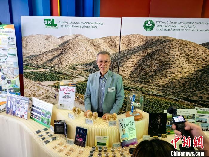 6月24日,“同心筑梦 共谋发展”粤港澳媒体湾区行第四场联合采访活动一行参访香港中文大学(简称“港中大”),了解香港农业技术的前沿研究与发展。图为港中大卓敏生命科学教授暨农业生物技术国家重点实验室主任林汉明与“陇黄”系列大豆。中新网记者 刘大炜 摄